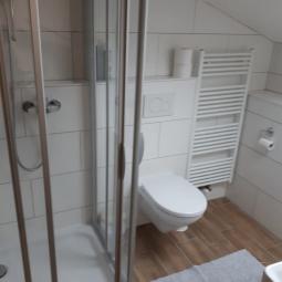 Separates Studio mit einem Schlafzimmer, Badezimmer mit Dusche und WC und einer kleinen Küche.